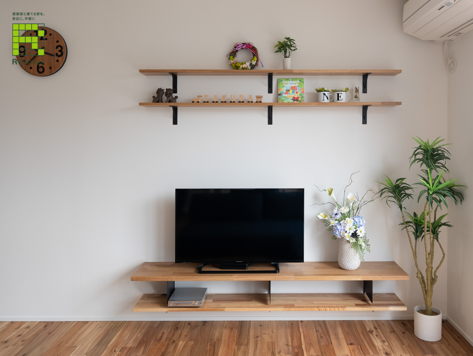 リビングの床にはアカシアの無垢材を採用。壁は白でシンプルにまとめ、明るくナチュラルな印象の空間になっています。テレビ台は集成材とブラックの金物を使った作り付け。飾り棚にはお気に入りの雑貨が飾られています。